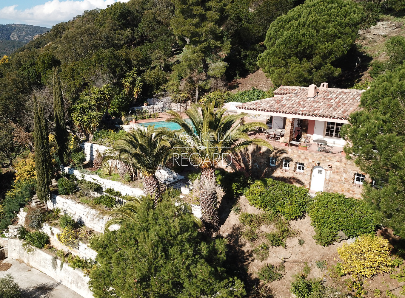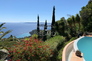 Face à la mer, au Rayol Canadel, le terrain d'environ 4 325m² est orienté Sud et offre une somptueuse vue mer sur le large et les îles du Levant et de Port Cros. Aménagé en terrasses avec des murs en pierres, le jardin paysager abrite une belle collection d'essences méditerranéennes. Construite dans un style provençal, sur 3 niveaux, la villa vue mer d'environ 145m² accueille 4 chambres et un beau séjour avec poutres et plafond rampant. Une grande terrasse couverte prolonge la façade Sud jusqu'à l'espace piscine et jouit pleinement du panorama exceptionnel sur la mer. Piscine à horizon d'eau. DPE : F.