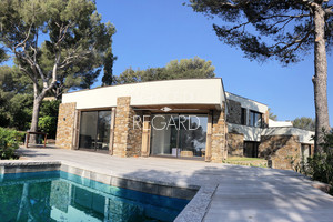 A Bormes-les-Mimosas, dans le domaine privé et gardienné du Gaou Bénat, cette propriété d'environ 1 214m² offre une magnifique vue sur la mer, le port de Bormes et la baie du Lavandou jusqu'au Cap Nègre. Le terrain est joliment paysagé avec des murs de pierres sèches. Aucun vis-à-vis ne vient perturber ce lieu rempli de charme. La plage et l'épicerie sont à 5 minutes à pied. C'est une villa d'architecte vue mer d'environ 130m² entièrement rénovée en 2017 avec un équipement moderne complet et des matériaux de grande qualité. Elle abrite 4 chambres et profite d'une belle luminosité grâce à ses grandes ouvertures par des baies vitrées.